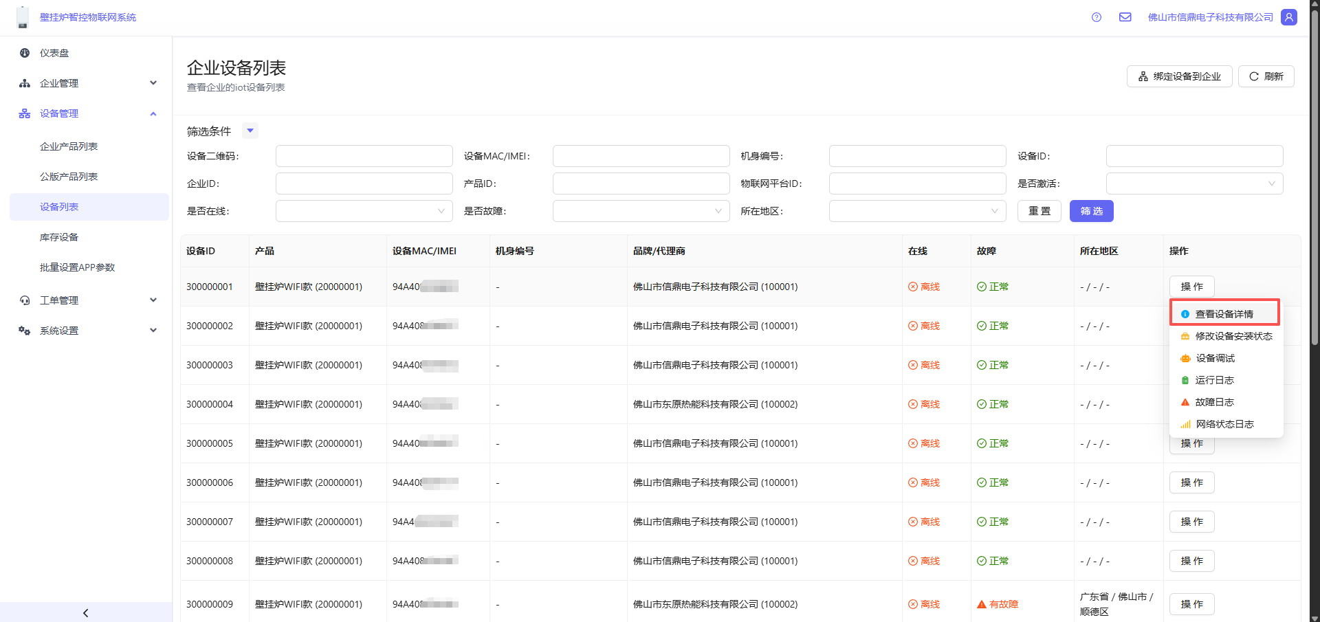 打开 设备管理 -> 设备列表 -> 找到设备后,点击操作按钮 -> 查看设备详情