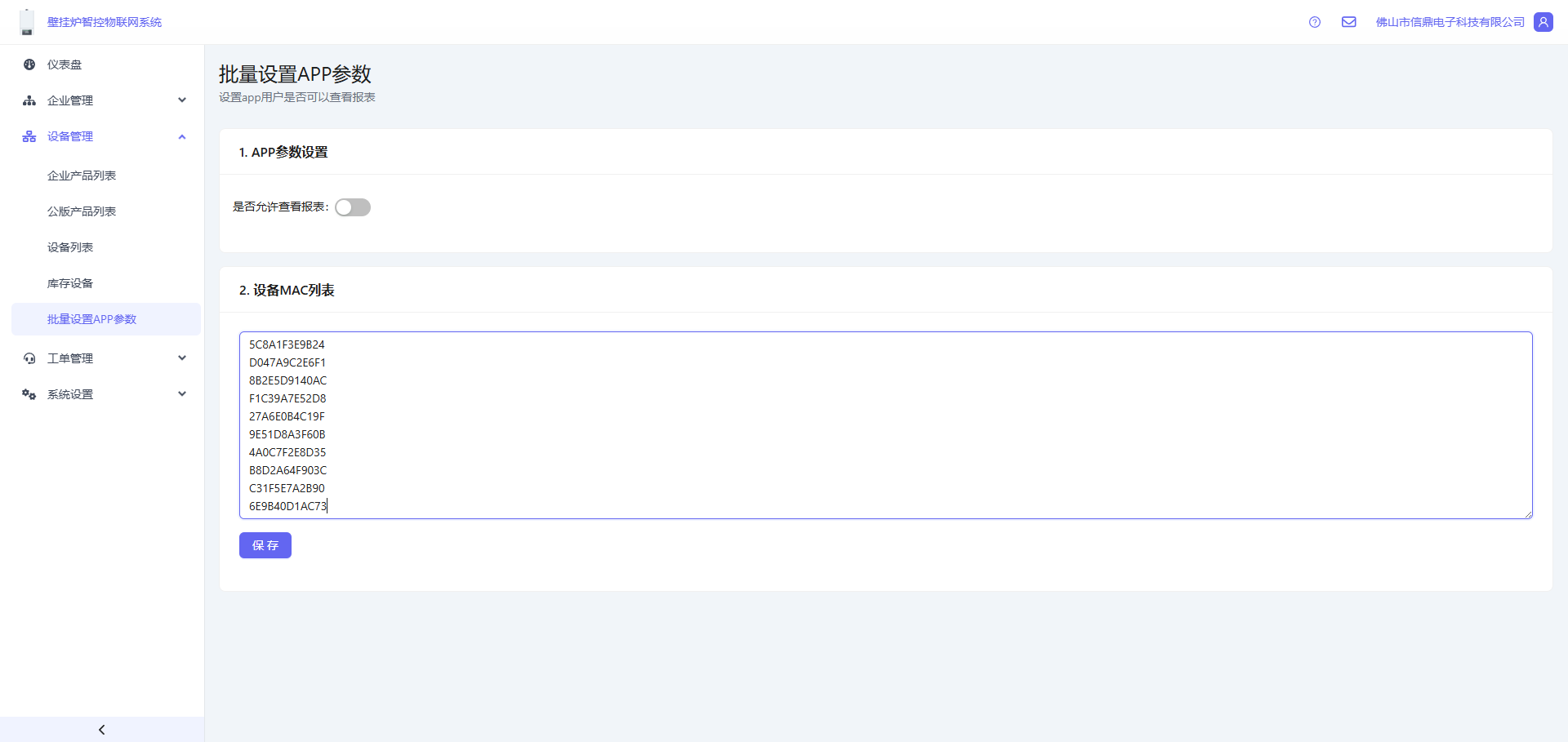 修改报表可见开关,mac列表填入需要设置的设备的mac,每行一个设备编号