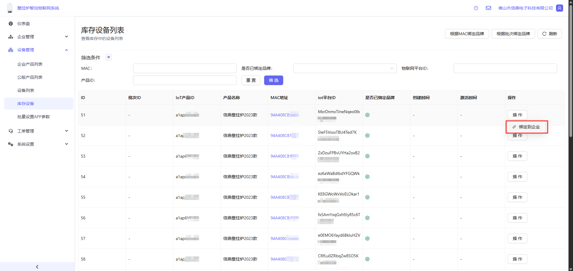 - 打开 设备管理 -> 库存设备 -> 找到设备后,点击操作按钮 -> 绑定到企业