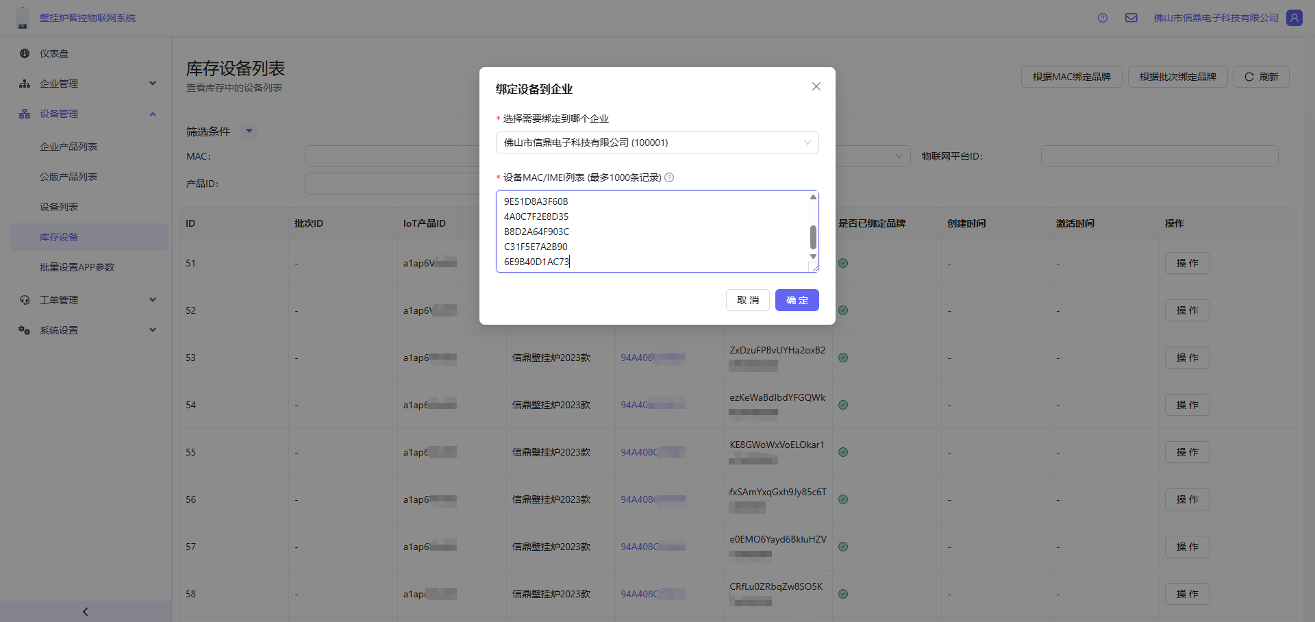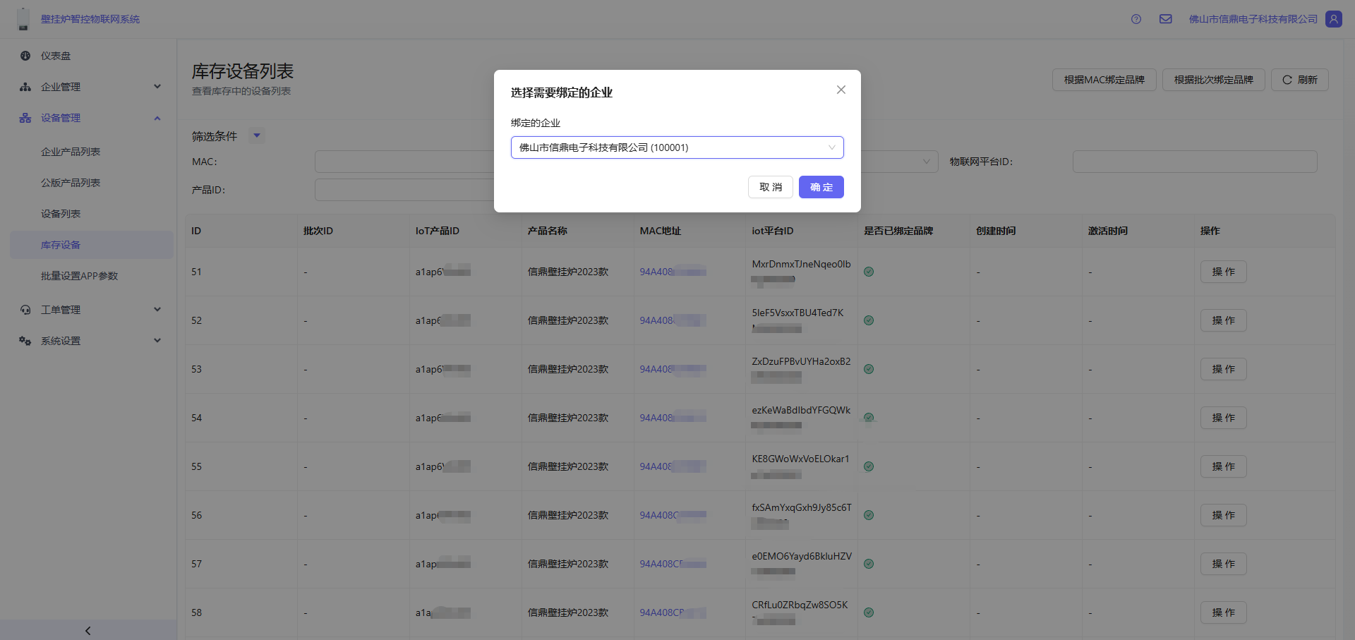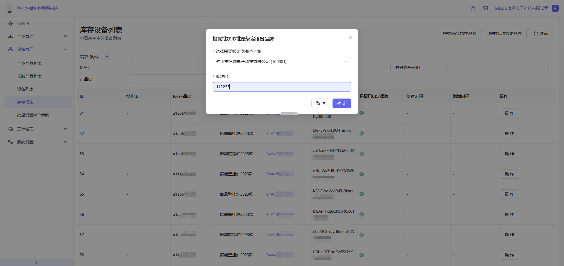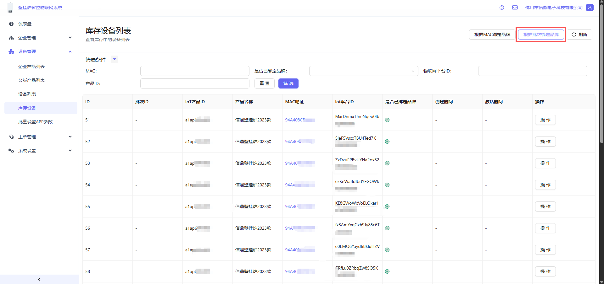 - 打开 设备管理 -> 库存设备 -> 点击右上角的根据批次绑定品牌