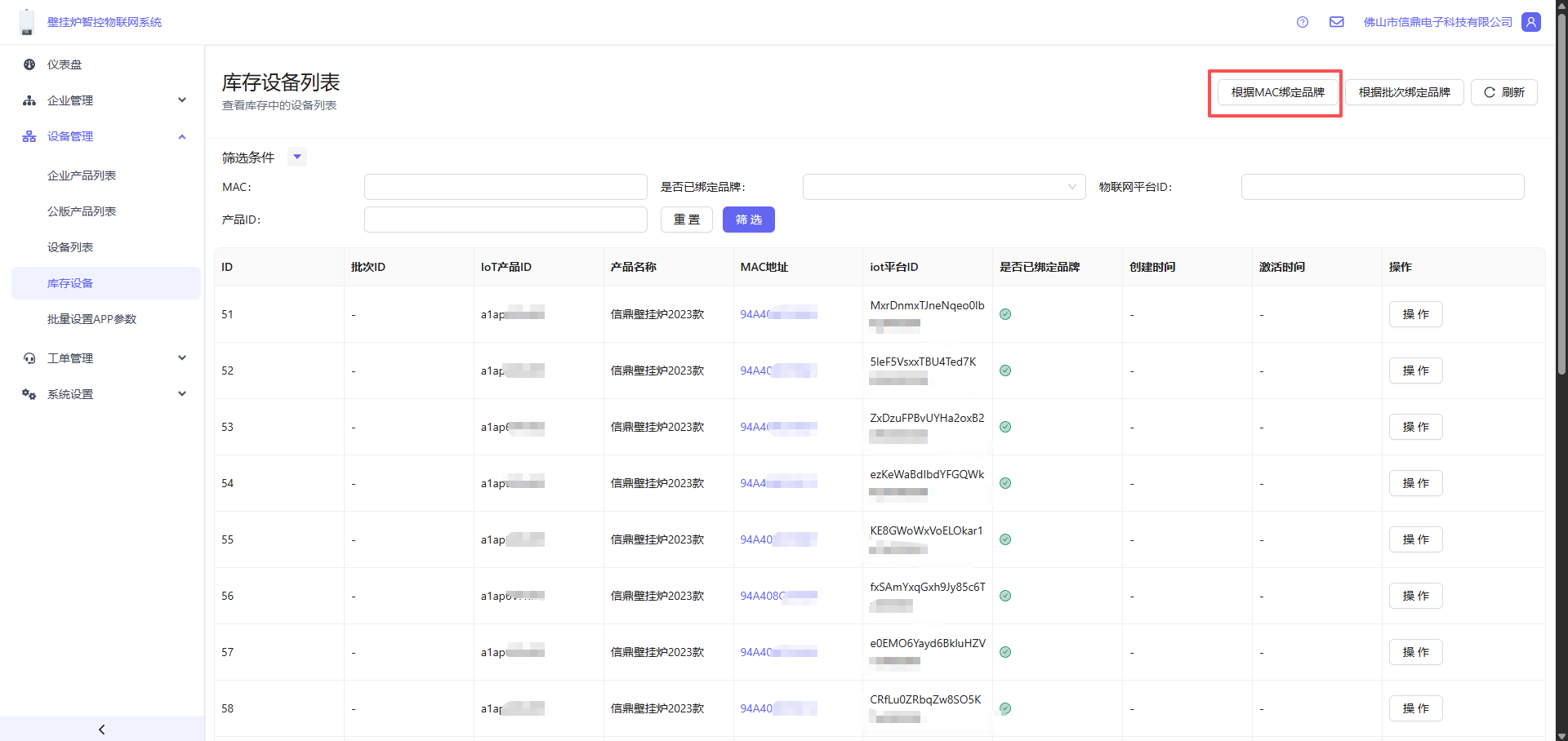- 打开 设备管理 -> 库存设备 -> 点击右上角的根据MAC绑定品牌