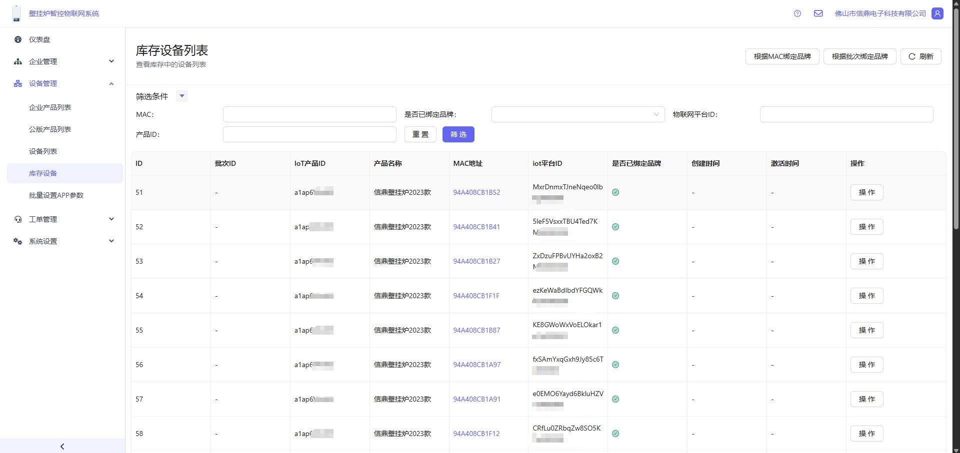 库存设备默认是对品牌企业不可见的,因为设备出厂时,不知道归属到哪个企业,设备执行了绑定流程后,就会把设备归属到具体的一家品牌企业。
