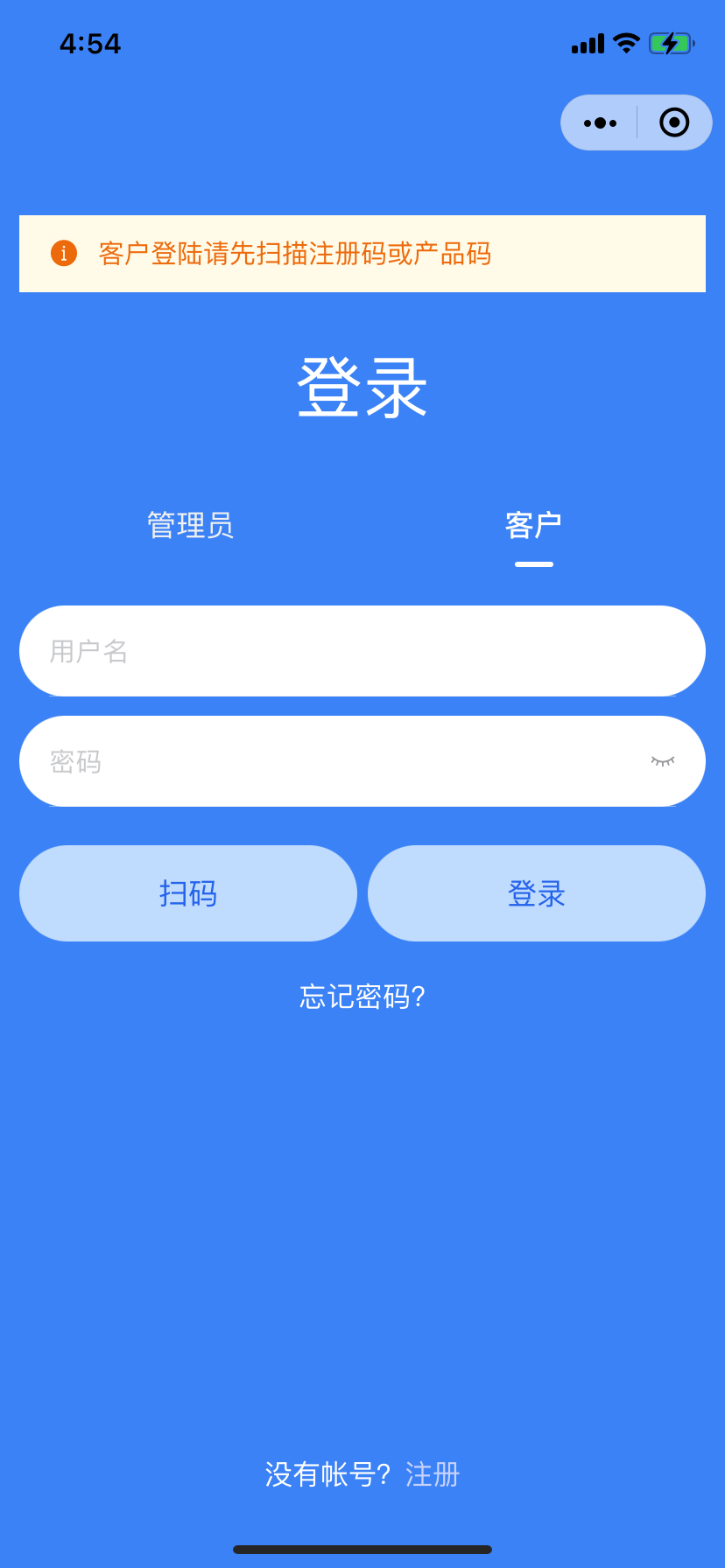app用户可以自行注册,小程序与app用户帐号相同,小程序注册后,app可以直接登录。app用户注册或登录时,需要先扫描二维码。