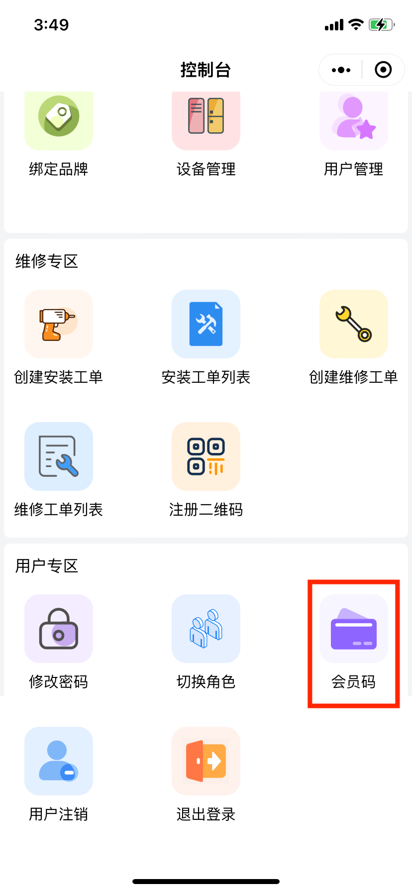 每个用户在系统中都有独一无二的会员码,在需要输入用户手机的地方,都可以直接通过扫描会员码完成识别直接填入。