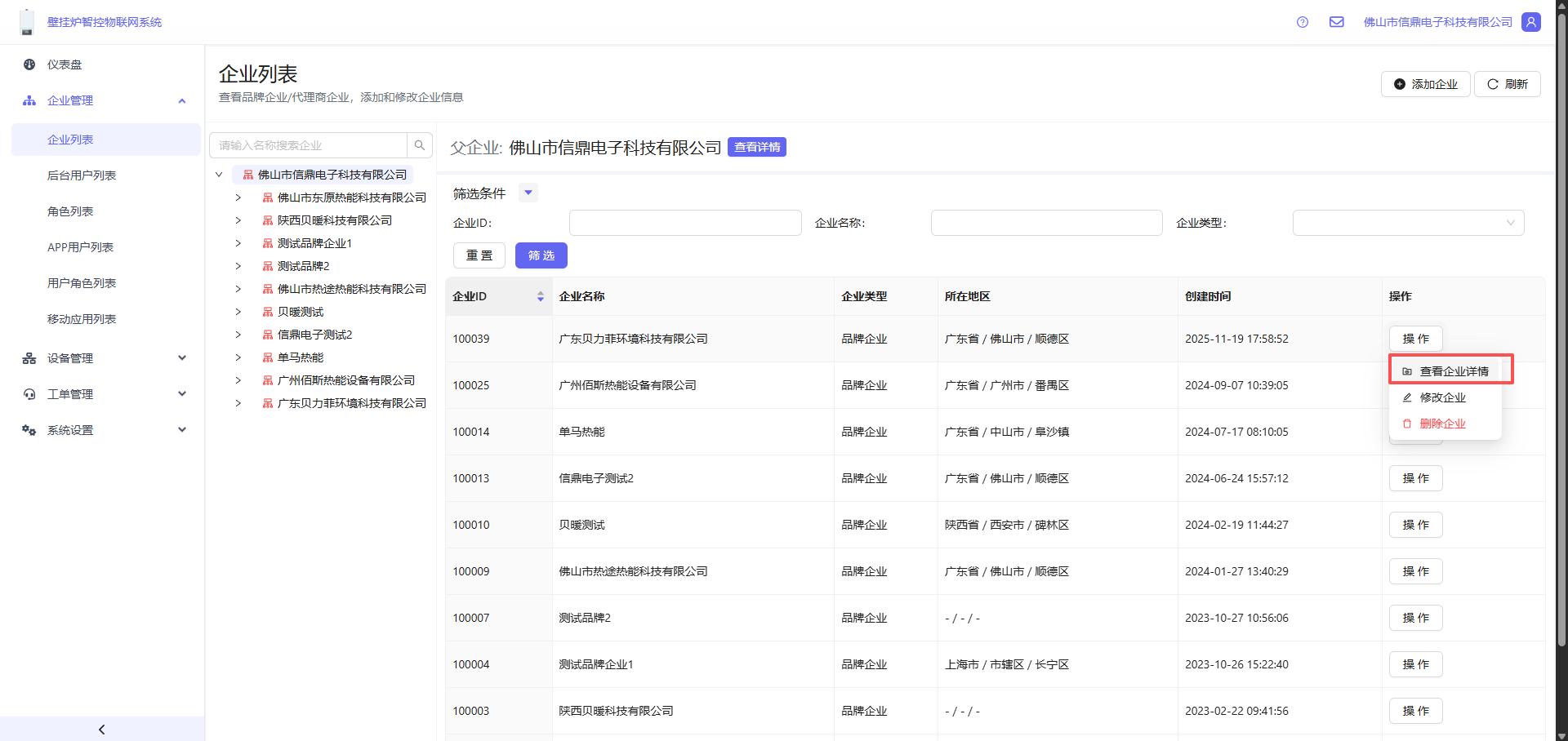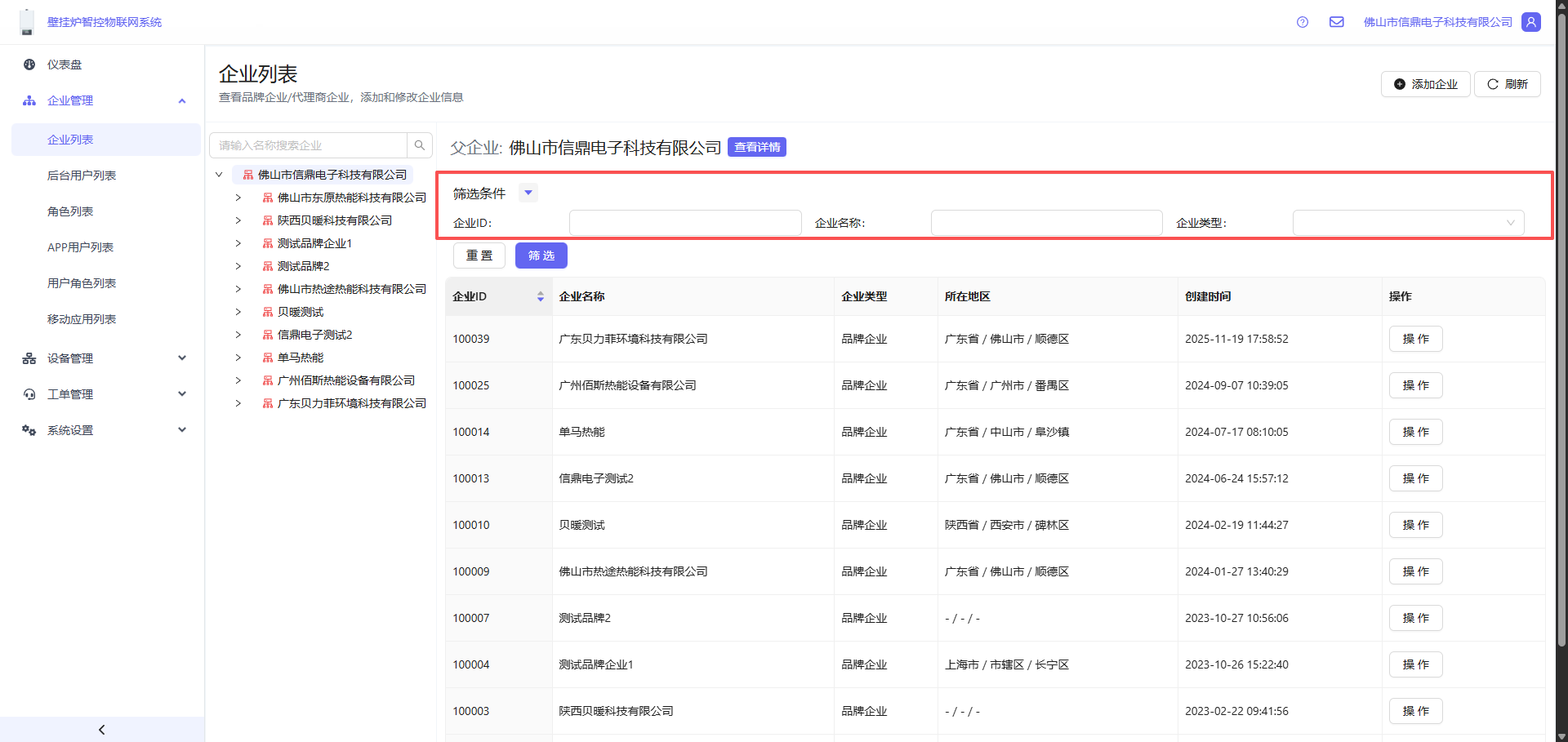用户可以通过图中红框部分的输入框筛选企业,支持多个字段过滤筛选。
