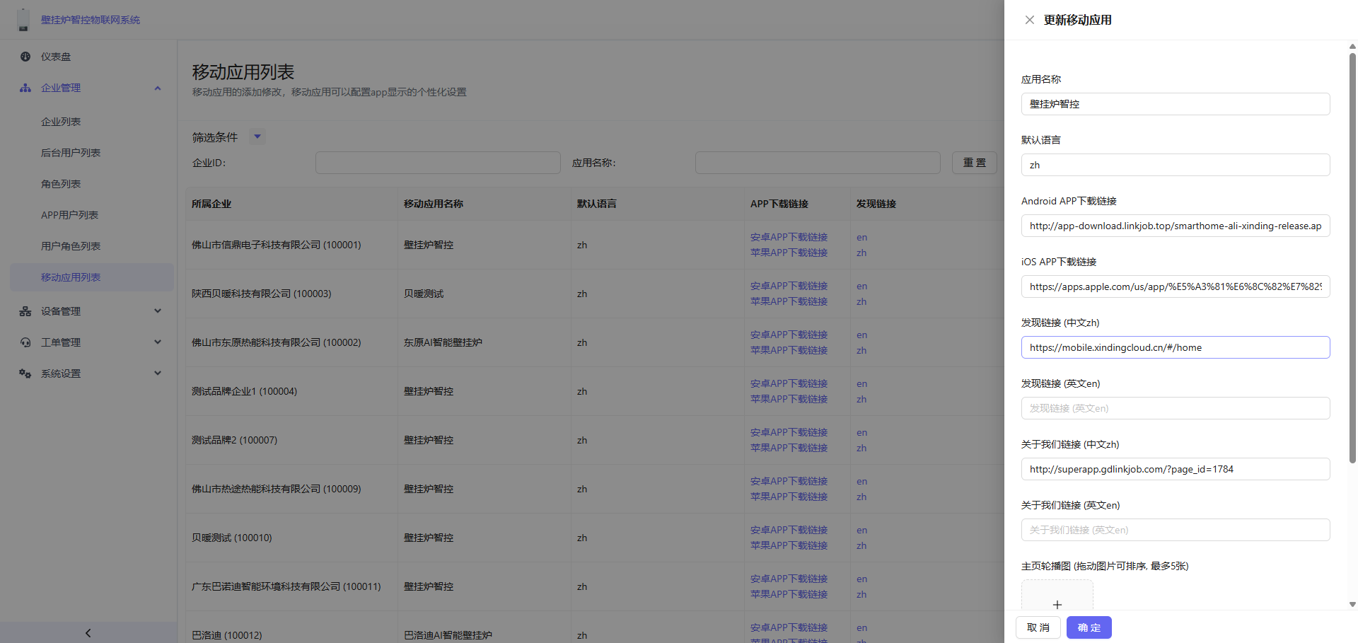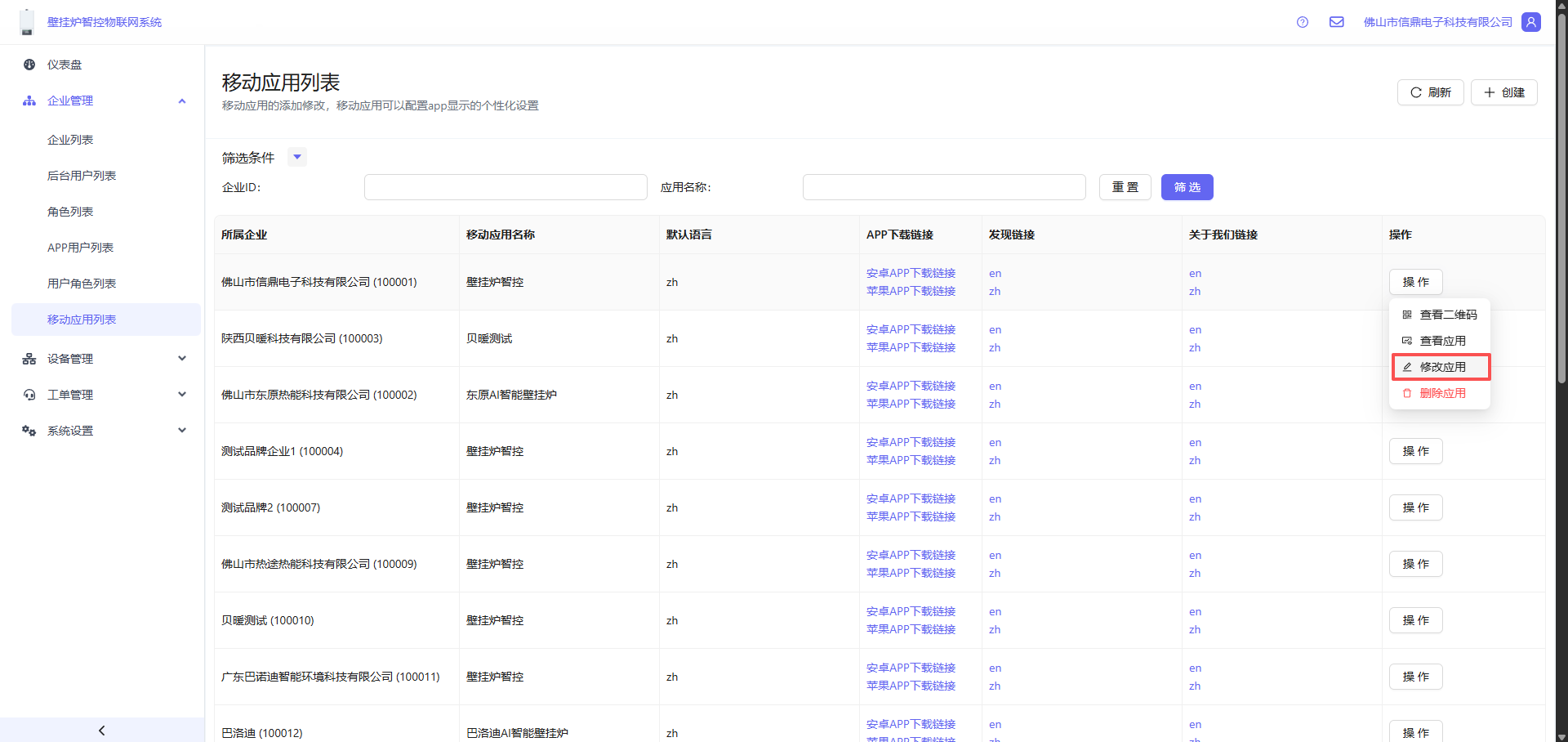 - 打开左侧导航栏的移动应用列表页面,选择要定制的企业的app,并点击操作按钮,选择修改应用。