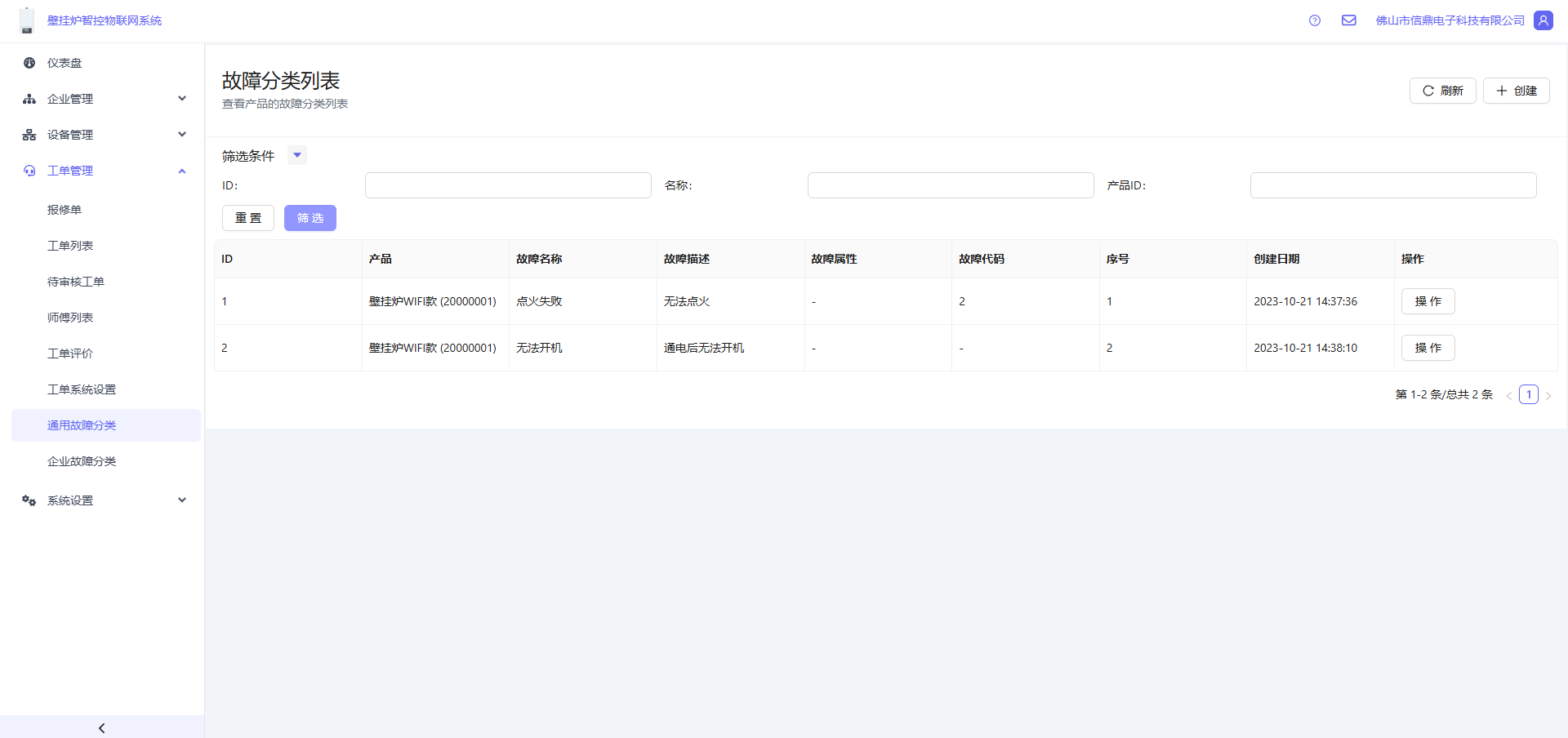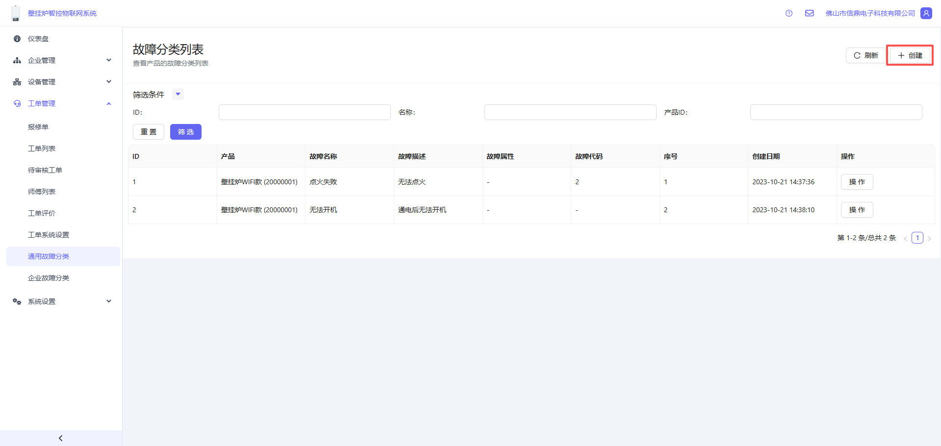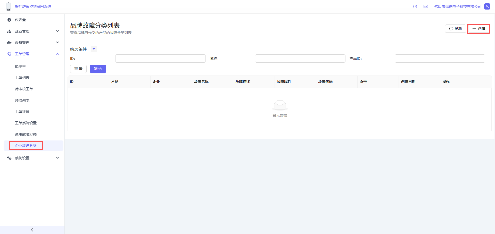 - 打开 工单管理 -> 工单通用故障分类, 点击右上角的创建按钮